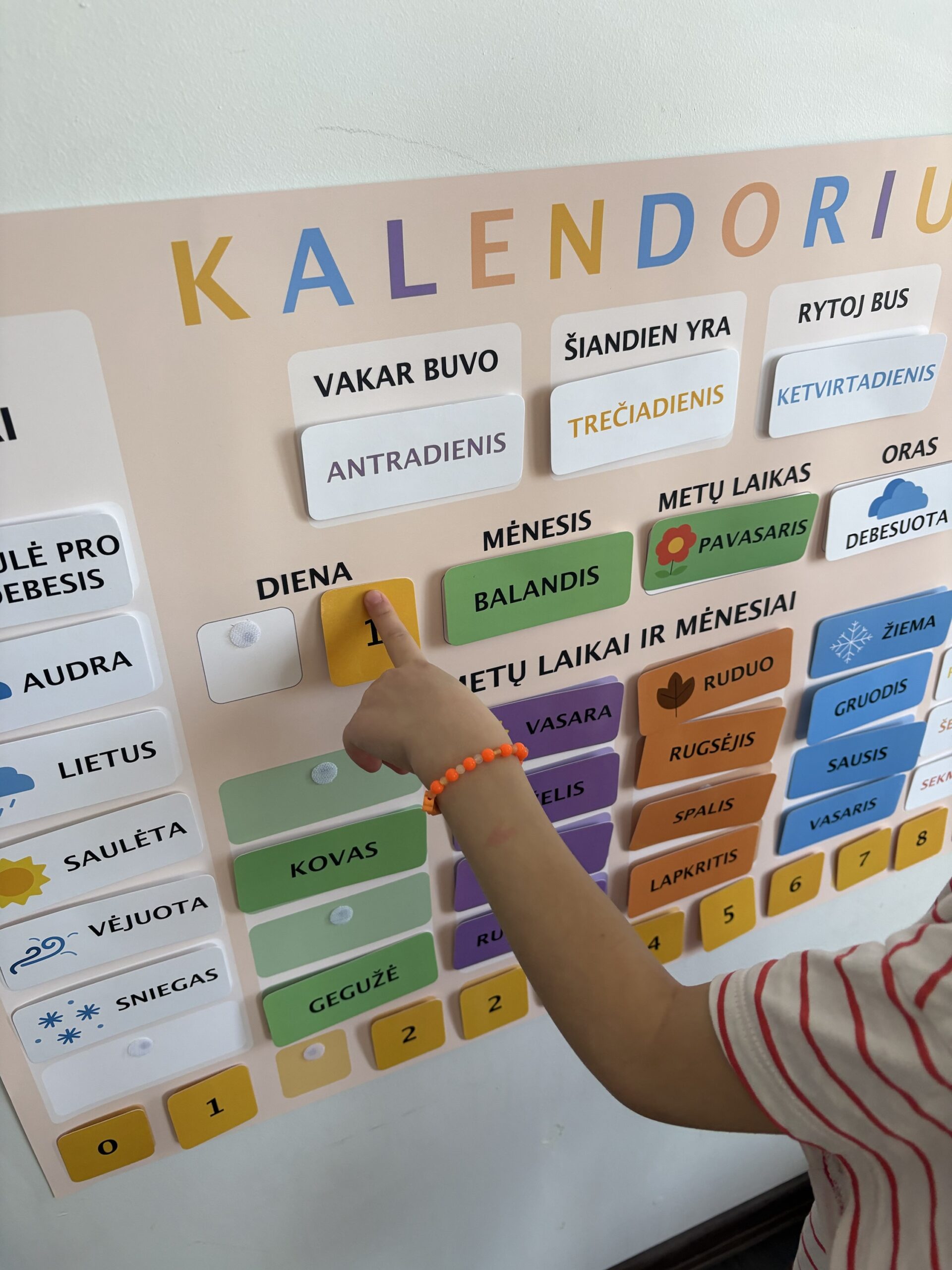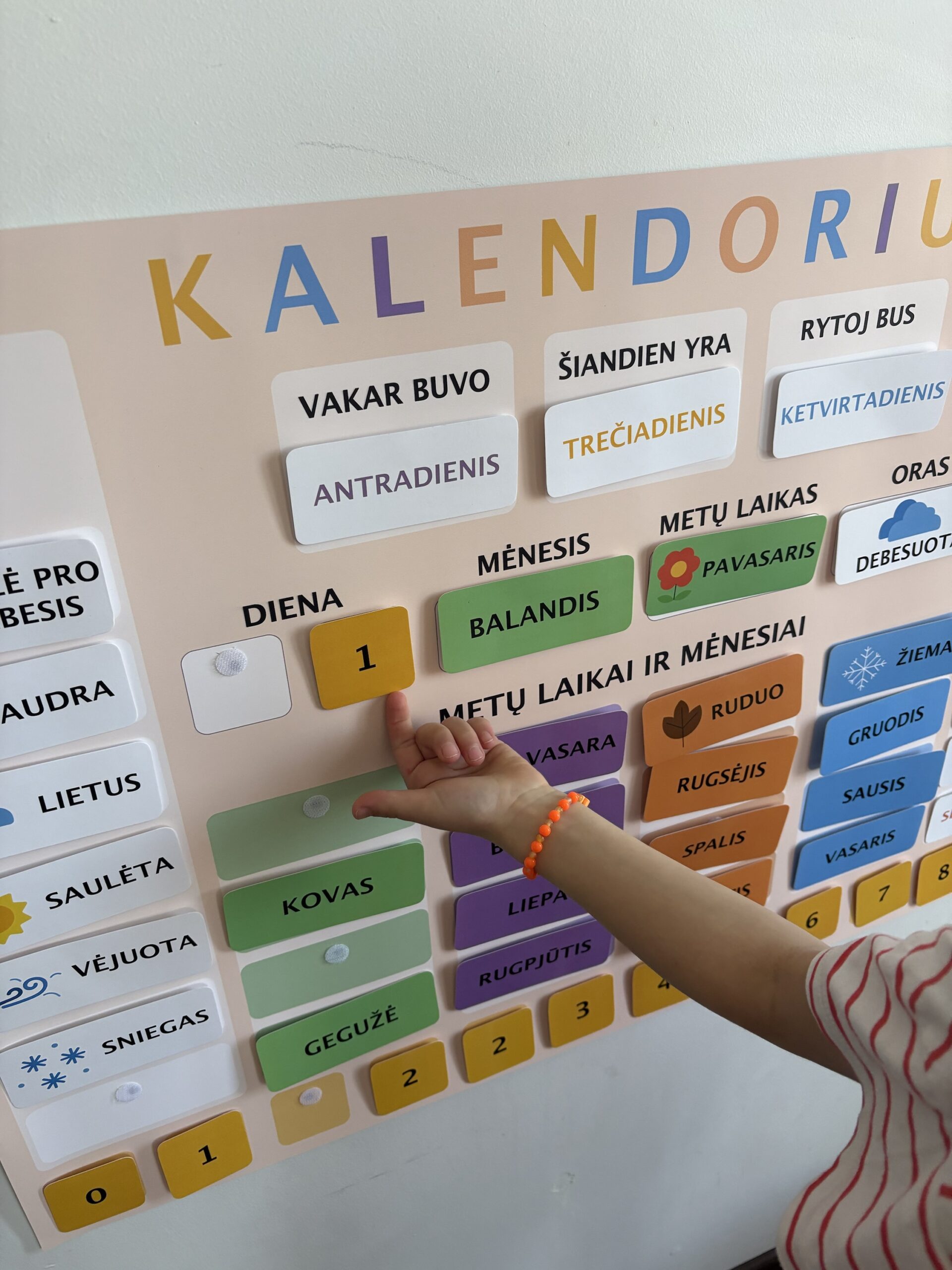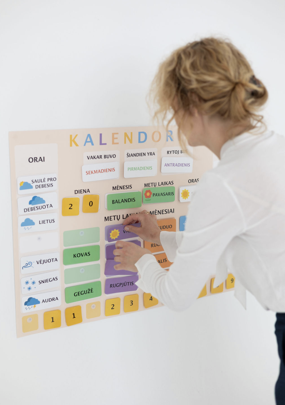 Naudodami šį kalendorių vaikai kasdien aktyviai įsitraukia į dienos pažinimą: keičia datas, stebi orą, įvardina savaitės dienas ir mokosi orientuotis laike natūraliai – per veiksmą.
