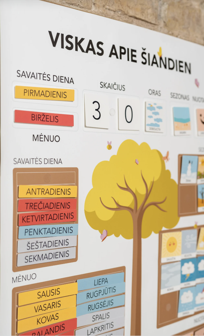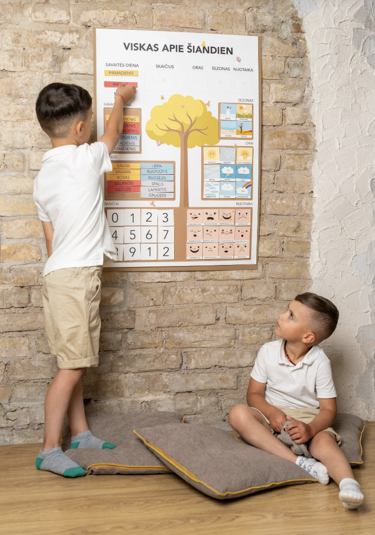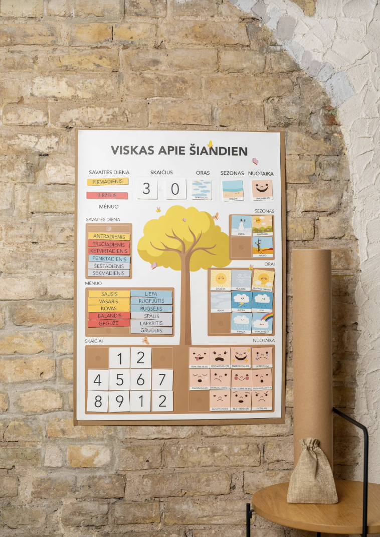 Atraskite inovatyvų edukacinį dienos kalendorių vaikams, kuris taps ne tik žaisminga interjero detale, bet ir nepakeičiamu kasdieniu pagalbininku mokantis pažinti dienas, savaites, mėnesius, metų laikus ir kitus pagrindinius elementus. Šis ryškiaspalvis sieninis kalendorius padeda lavinti vaikų atmintį, mąstymą bei pažinimo įgūdžius per smagią ir aktyvią veiklą. Puiki dovana kūrybingiems ir smalsiems mažiesiems!