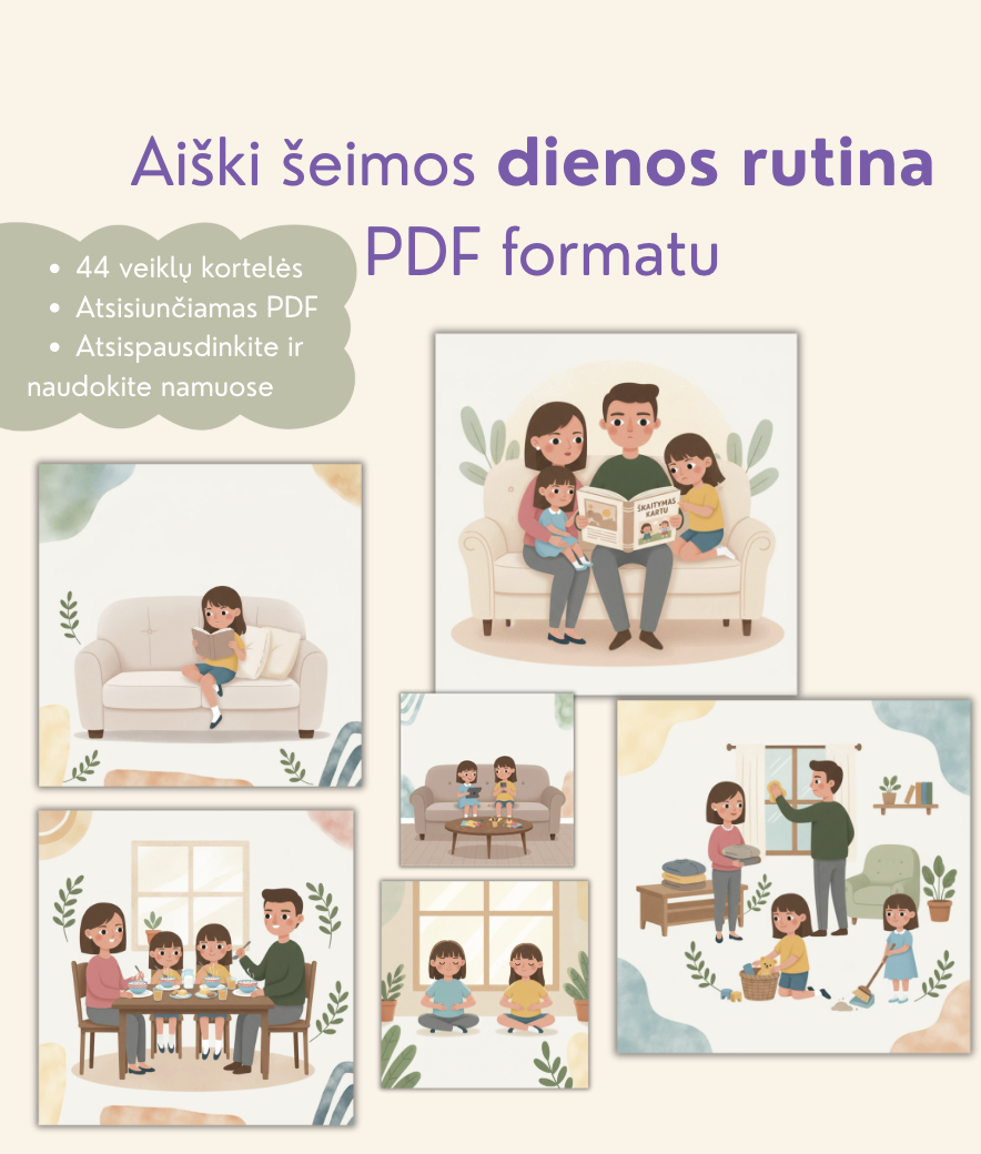 Šeimos dienos veiklų kortelės (PDF) – rinkinys, padedantis kurti aiškią šeimos dienos rutiną ir daugiau kokybiško laiko kartu su vaikais.
