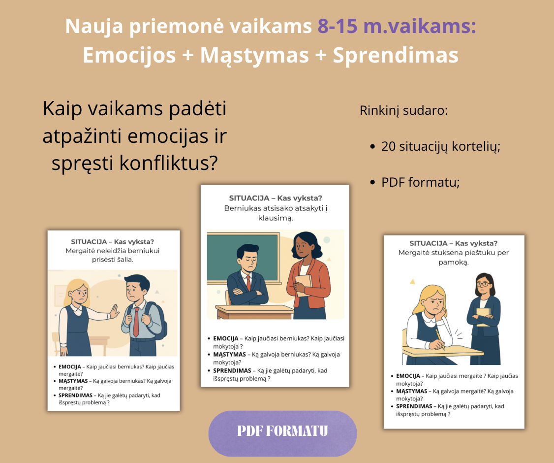 Situacijų kortelės vaikams „SITUACIJA – EMOCIJA – MĄSTYMAS – SPRENDIMAS“. Rekomendacija 8-15 m. vaikams.